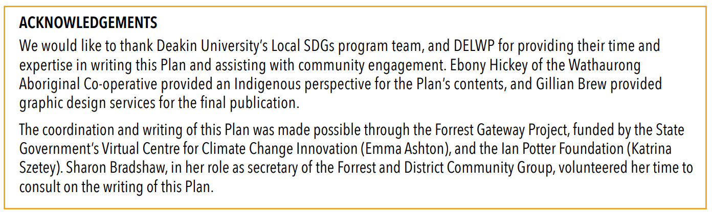 The Forrest & District Plan: Towards 2030 is a community initiative resulting from years of research and consultation between the Forrest and District Community Group, Deakin University’s Local SDGs Program, Department of Environment, Land, Water and Planning (DELWP) and the Colac Otway Shire. The Plan was written during the COVID-19 Pandemic and takes into account its health and socio-economic impacts with a dynamic 10-year vision for the gateway to the Otway Ranges. The Plan has six key themes from which five sustainable development inspired goals were derived: