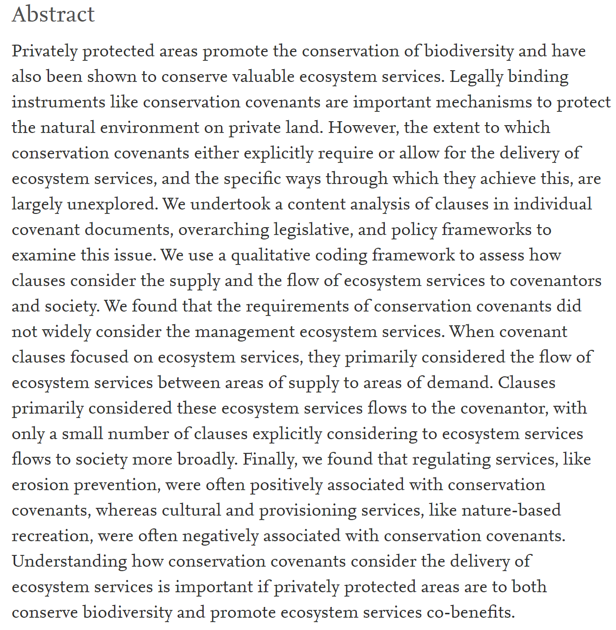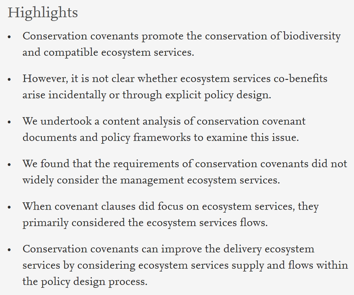 Fig. 1. Components of the ecosystem services supply chain framework and how they relate spatially to private land and conservation covenants. The private property in which the covenant is established on is represented by the brown area, and the conservation covenant extent is represented by the green circle.
